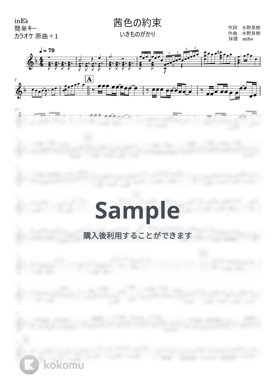 いきものがかり「茜色の約束」のin E♭(アルトサックス、バリトンサックス等)用譜面です。