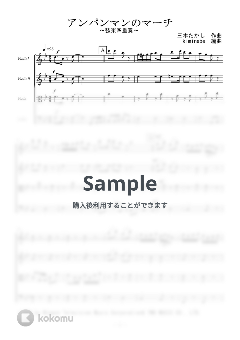 「アンパンマンのマーチ」の弦楽四重奏(Vn2,Va,Vc)です。スコア及び各パート譜です。