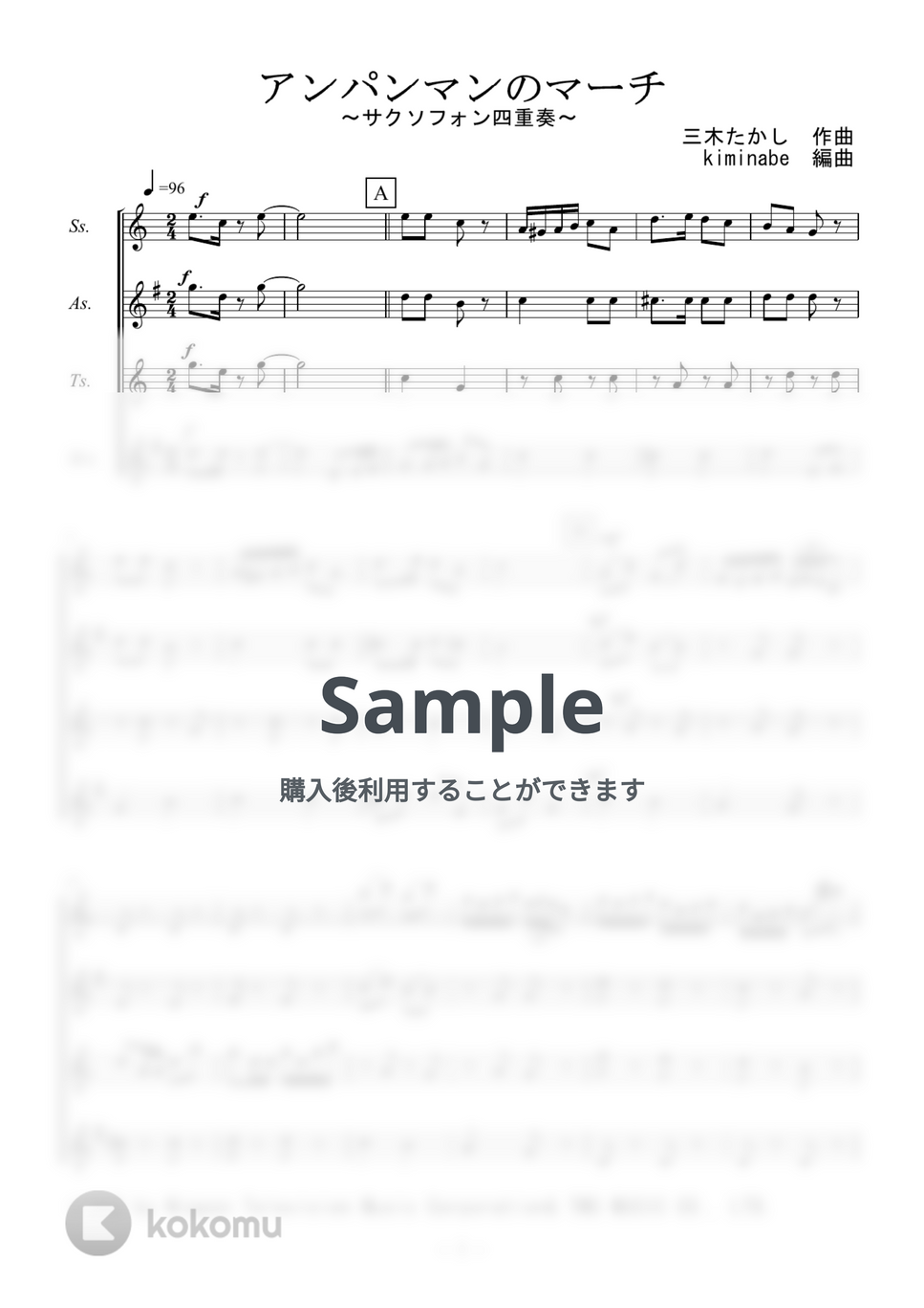 「アンパンマンのマーチ」のサクソフォン四重奏(SATB)です。スコア及び各パート譜です。