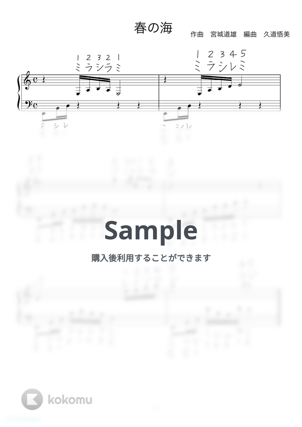 宮城道雄『春の海』をピアノソロアレンジしました。ドレミ付き、運指番号付きです。オリジナルの長さではありませんので、ご了承の上でご購入をお願いいたします。