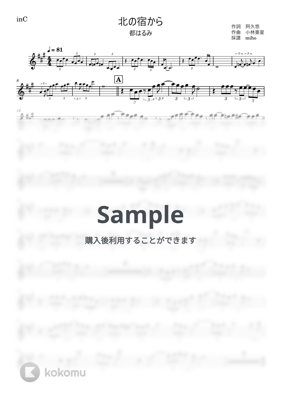 都はるみ「北の宿から」のin C(メロディ、フルート等)用譜面です。