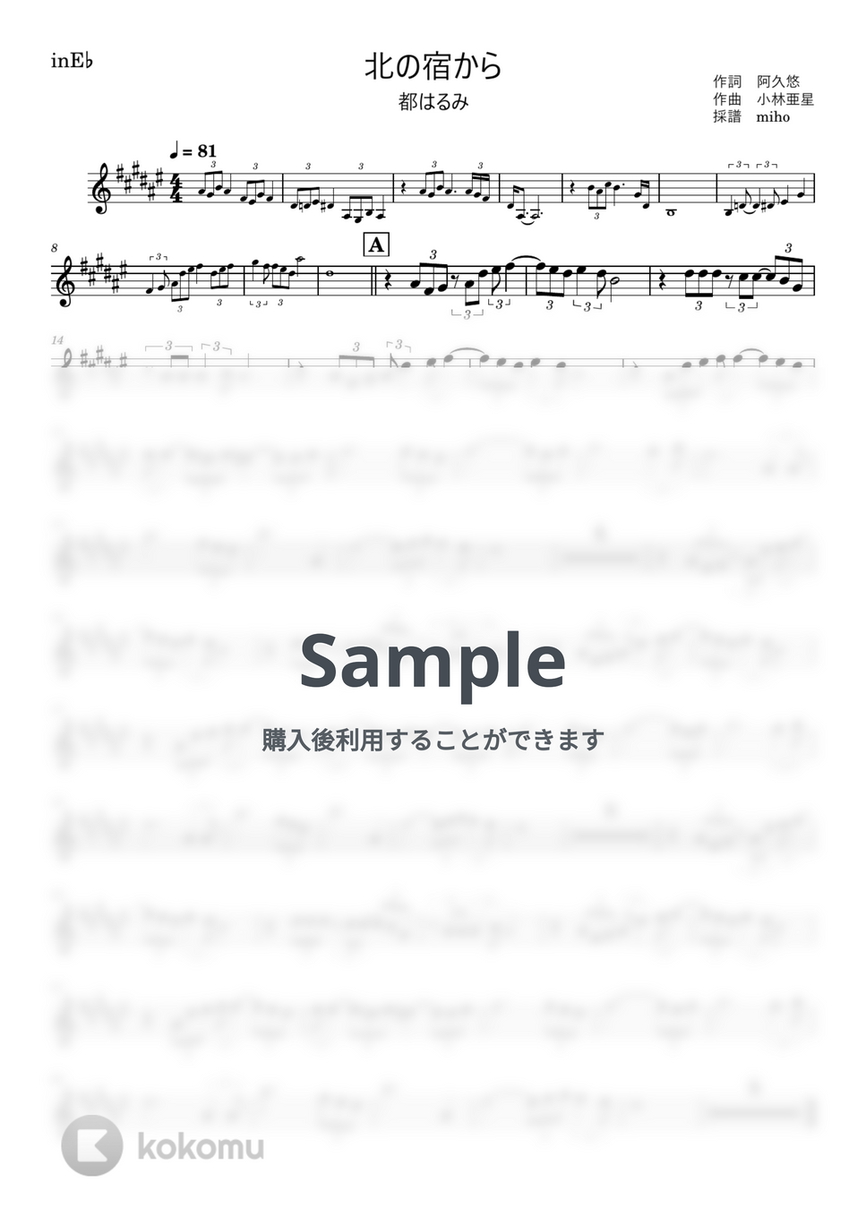 都はるみ「北の宿から」のin E♭(アルトサックス、バリトンサックス等)用譜面です。