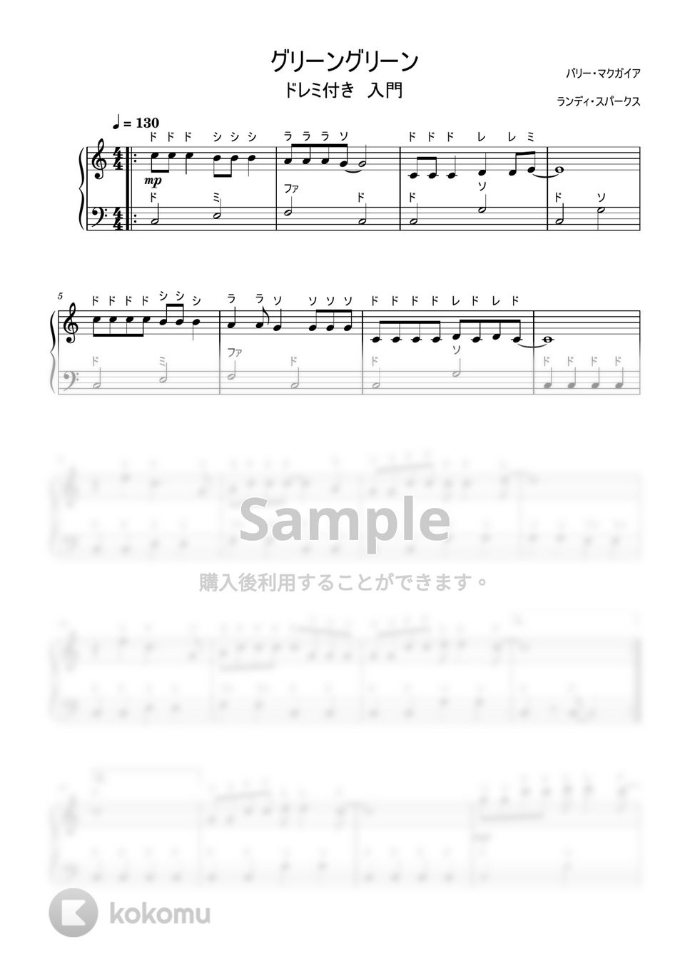 グリーングリーン (ドレミ付き 簡単楽譜)