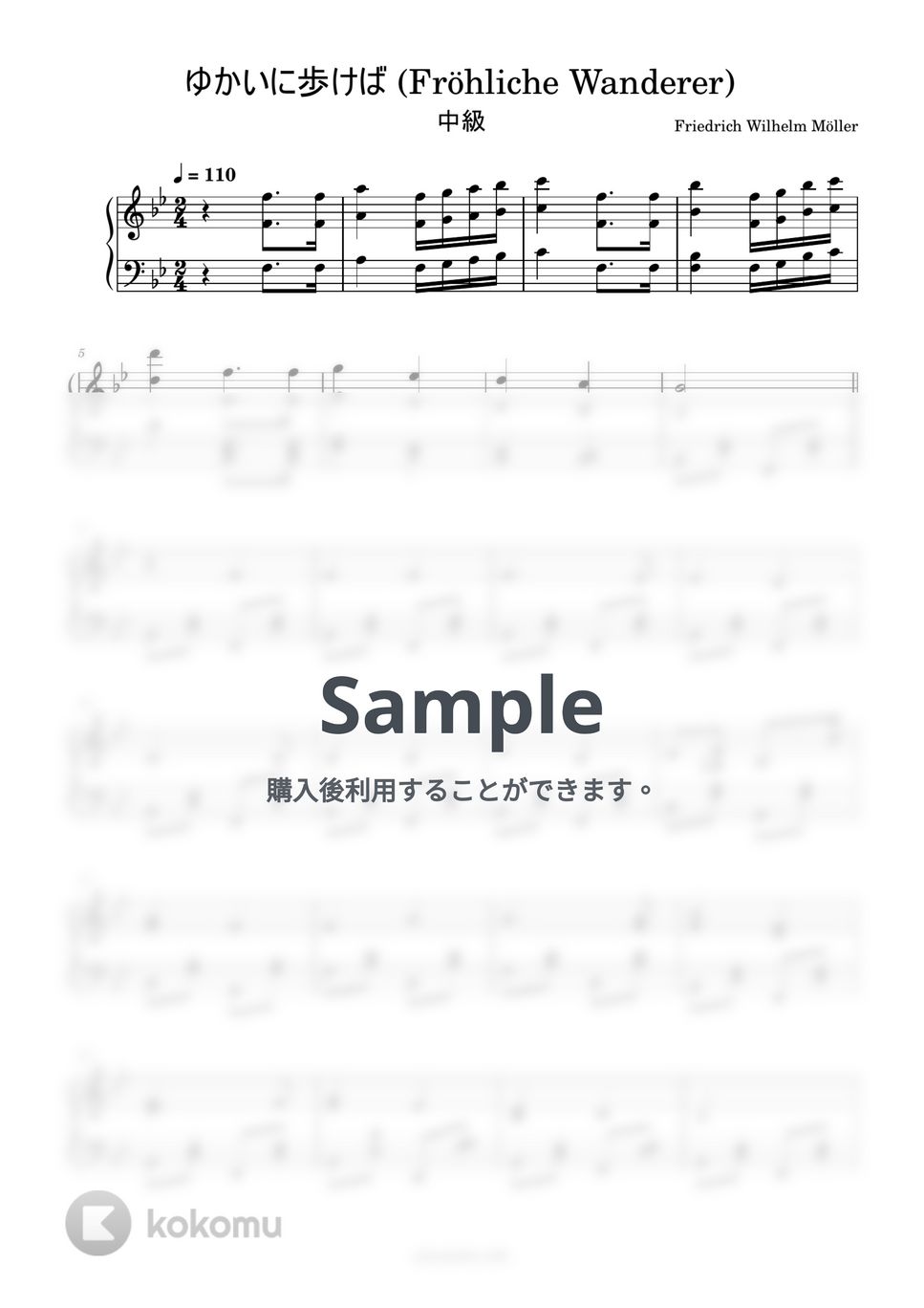 小学校の音楽で学ぶ曲の1つで「バルデリ・バルデラ」の歌詞で有名な「ゆかいに歩けば(Der fröhliche Wanderer)」のピアノ楽譜です。