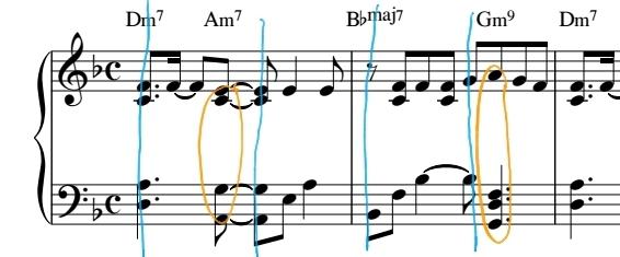 なのでちょっと難しいかもしれませんが、このような裏拍子が曲をよりリズミカルで洗練された雰囲気にしてくれます。