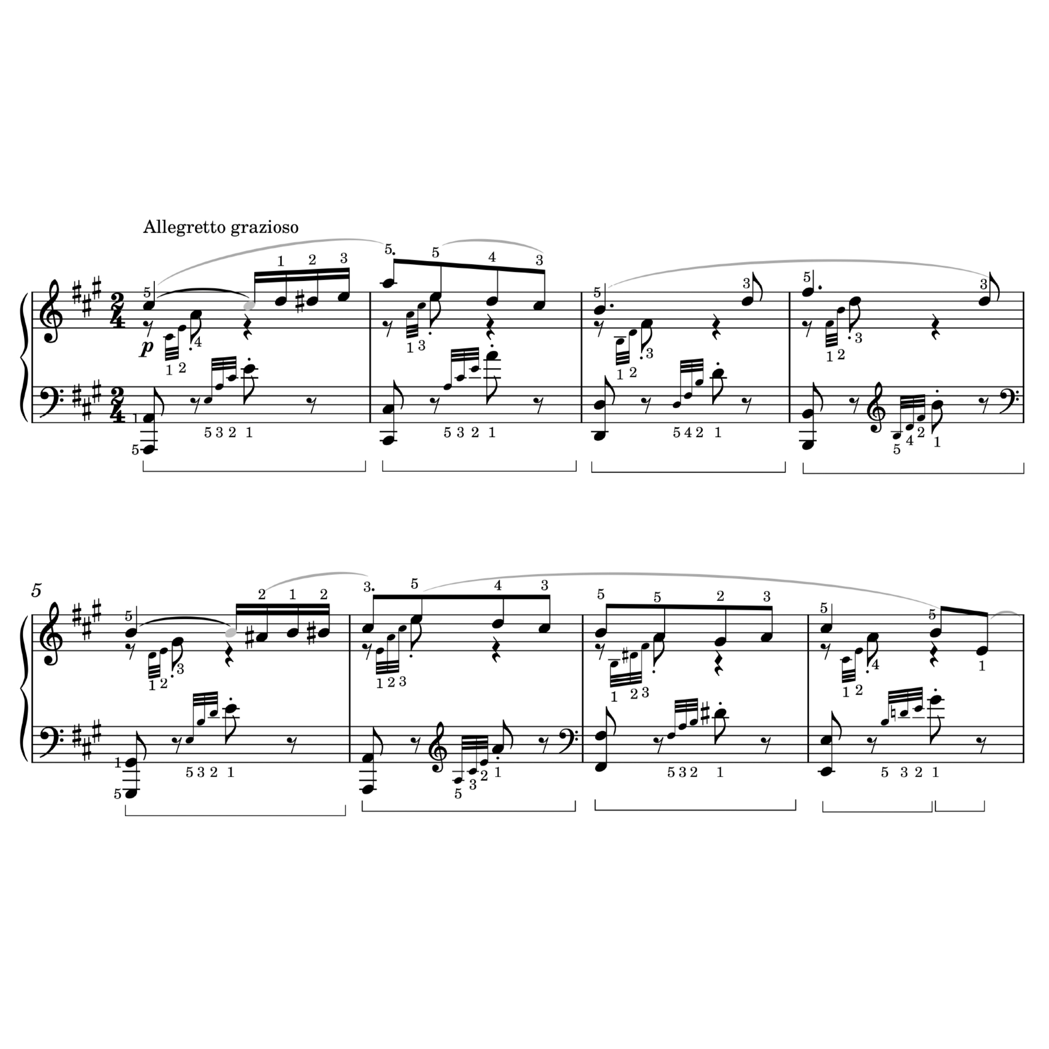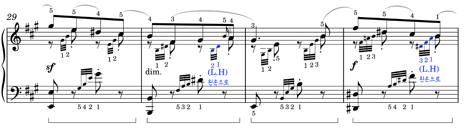 손번호, 페달, 프레이즈, 아티큘레이션이 모두 적혀있는 악보이며,